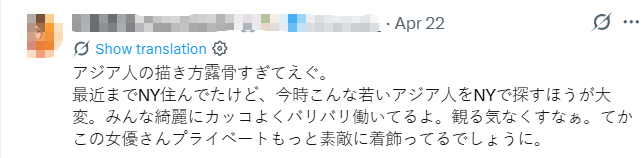 “片子对亚洲人的刻画也太赤裸裸了。我之前一直住在纽约,现在片里那种年轻亚洲人反而不好找。大家都打扮得很好、很有型,而且工作也很拼。真是不想看了。再说这位女演员私下明明打扮得更好看吧。”