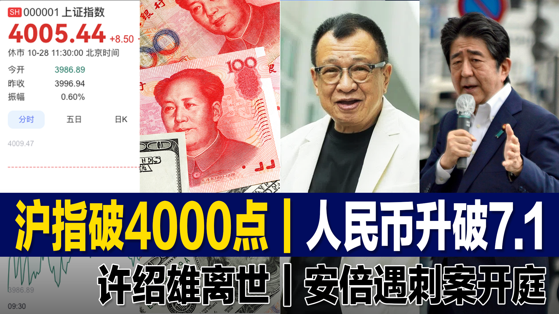 【国际快讯】沪指破4000点|人民币升破7.1|许绍雄离世|安倍遇刺案开庭